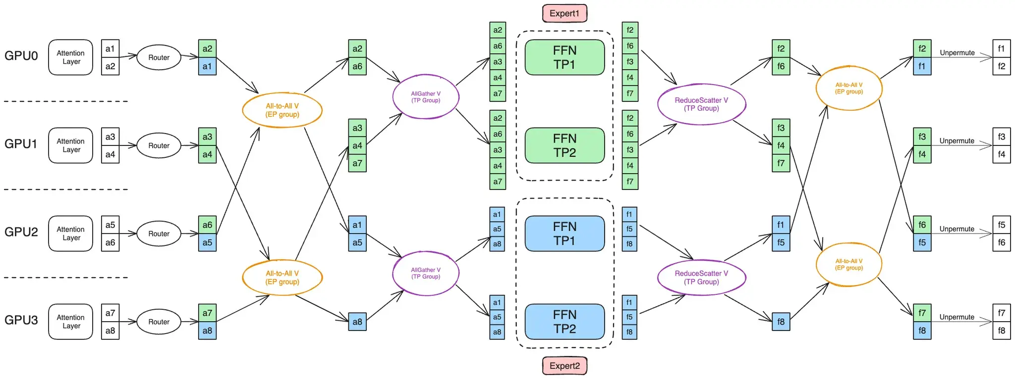 ),这样就满足了 DeepEP 的假设,实质上利用 DeepEP 把 TP 的通信也做了。
