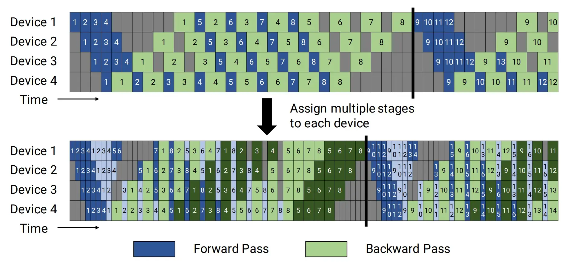 见到过两种画法:一是 device 1 调度到 PP*VPP 个微批次之后继续调度,二是 device 1 调度到 PP*VPP 微批次之后就停下了。