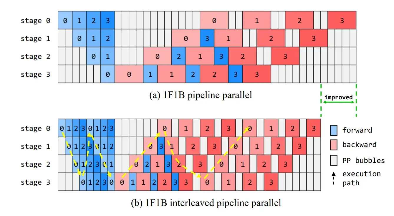 这个是 Megatron 的论文 Efficient Large-Scale Language Model Training on GPU Clusters Using Megatron-LM 第 3 页 https://arxiv.org/pdf/2104.04473 ,同时显示了交错和非交错状态下 1F1B 的调度方式。