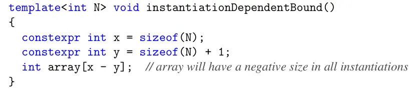 没有出现任何依赖关系,因为上面代码的数组的长度会是负数,这段代码在函数未实例化时也不能通过编译。