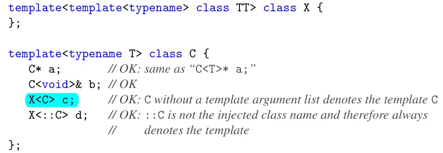 类模板的情况会复杂一些。向内注入的非限定名既可以指模板,又可以指模板类。如果想要显式表示模板,可以使用限定名。