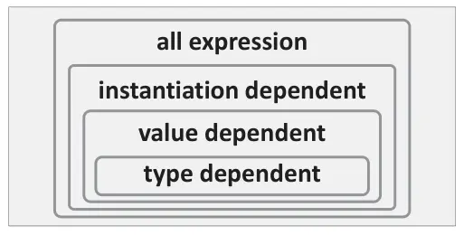 type dependent 指的是类型和模板参数有关;value dependent 指的是值和模板参数有关;instantiation dependent 指的是实例化与模板参数有关。
