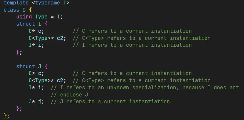 类模板中省略参数,或者使用与本类模板完全一致的参数,被称为 current instantiation。而使用其他参数被称为 unknown specialization。因为类模板可以特化,在链接完成之前,不知道其他参数的类有什么内容,无法做出假定。比如: