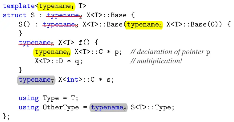 由于不知道模板参数,类模板编译时无法对类模板的成员做出判断,现在的解决方法是把类型依赖名理解成值,除非用 typename 前缀显式表示类型,或者用 template 前缀显式表示模板。下图中灰色表示是否使用 typename 都是可以的,黄色表示必须使用,删除线表示不能使用: