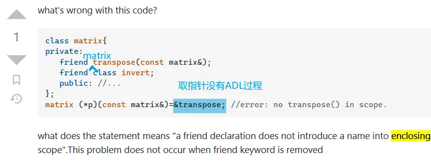 ADL 失效的情况:① 调用前给函数名加上括号,这样就必须先找到函数。② 函数模板在 C++20 之前除非在外部声明函数模板(参数列表可以不同),否则也无法被找到。因为在还没有看参数的情况下,函数模板没有被引入;还没有看参数列表的情况下不知道这个是函数模板;不知道这个是函数模板的情况下会把参数列表的头尾理解成大于和小于操作符。这是一种鸡生蛋蛋生鸡的问题。③ ADL 会忽略 using 声明,只考虑真正存在于名字空间的函数。