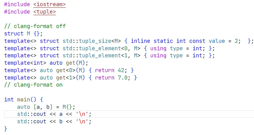 类模板的特化,使用静态常量提供元组的长度。template<> struct std::tuple_element<0, M> { using type = ?; };