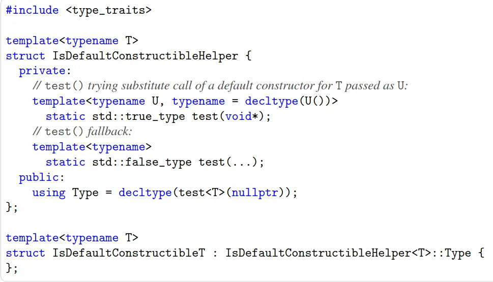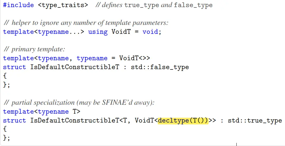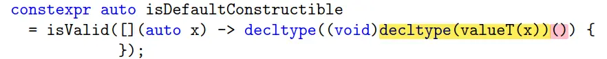 using IsDefaultConstructibleT = decltype(isDefaultConstructible(std::declval<T>()));