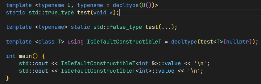 上面通过偏特化和继承直接达到了目的。这种写法更加简单,因为判断只有二元性,因此只需要提供原始模板 1 次,然后偏特化 1 次。C++17 已经有了 std::void_t