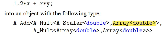 表达式模板主要用在大数组的计算上。以相加为例,应该支持的操作有:同长度的数组相加、数组和标量的相加。有时候表达式比较复杂,会涉及多个操作,这种场景下,手工编写代码效率高,但是需要自己控制循环;使用模板编写代码则需要想办法把操作一次性完成,避免多次内存分配和内存访问。