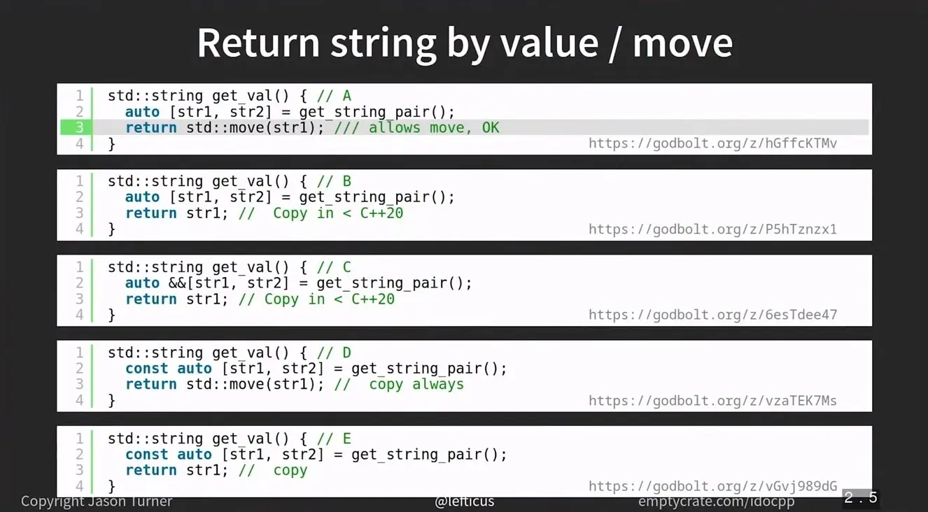 第 2 段代码在 C++20 之前不能被优化是因为结构化绑定的分量是结构体的一部分,作为返回值时不能被直接建在调用者的栈上。