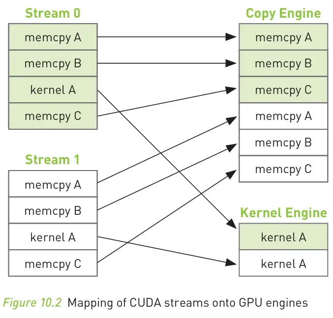 如果 GPU 只支持一次执行一个拷贝和 kernel 操作,那么按照后一种交错指定任务的写法,只有流 1 数据拷贝回 CPU 的操作能够和流 2 的 kernel A 运行并行化。但是有些比较好的 GPU 支持一次执行一个 kernel 操作和多个数据拷贝操作,这会让节约的时间更多。
