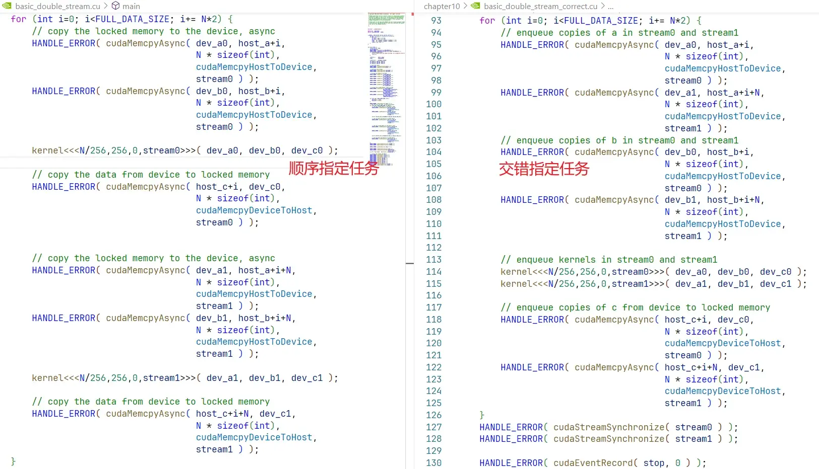 书中的 basic_double_stream.cu 将 chunks 拆分成了两组,偶数使用 stream0,奇数使用 stream1,但是最后的性能和使用单个流没有区别。