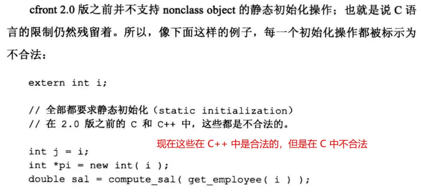 Cfront 早期对 class object 支持了非常量的静态初始化,但标准类型(整数、指针等)的静态支持和 C 一样。