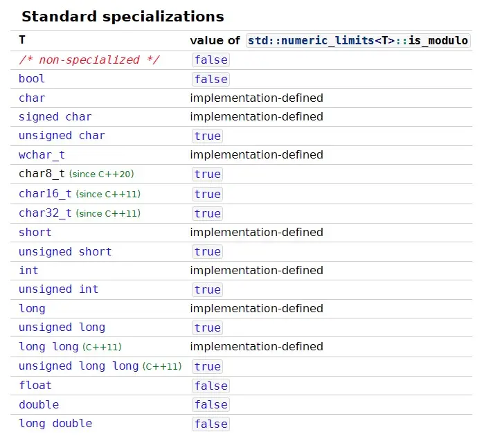 (C++17),但如果具体实现将其定义为模除,这个值可以为 true