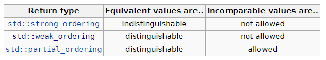 Three-way comparison operator 的返回值可以是偏序、弱序或强序。体现在 C++ 语言中是:
