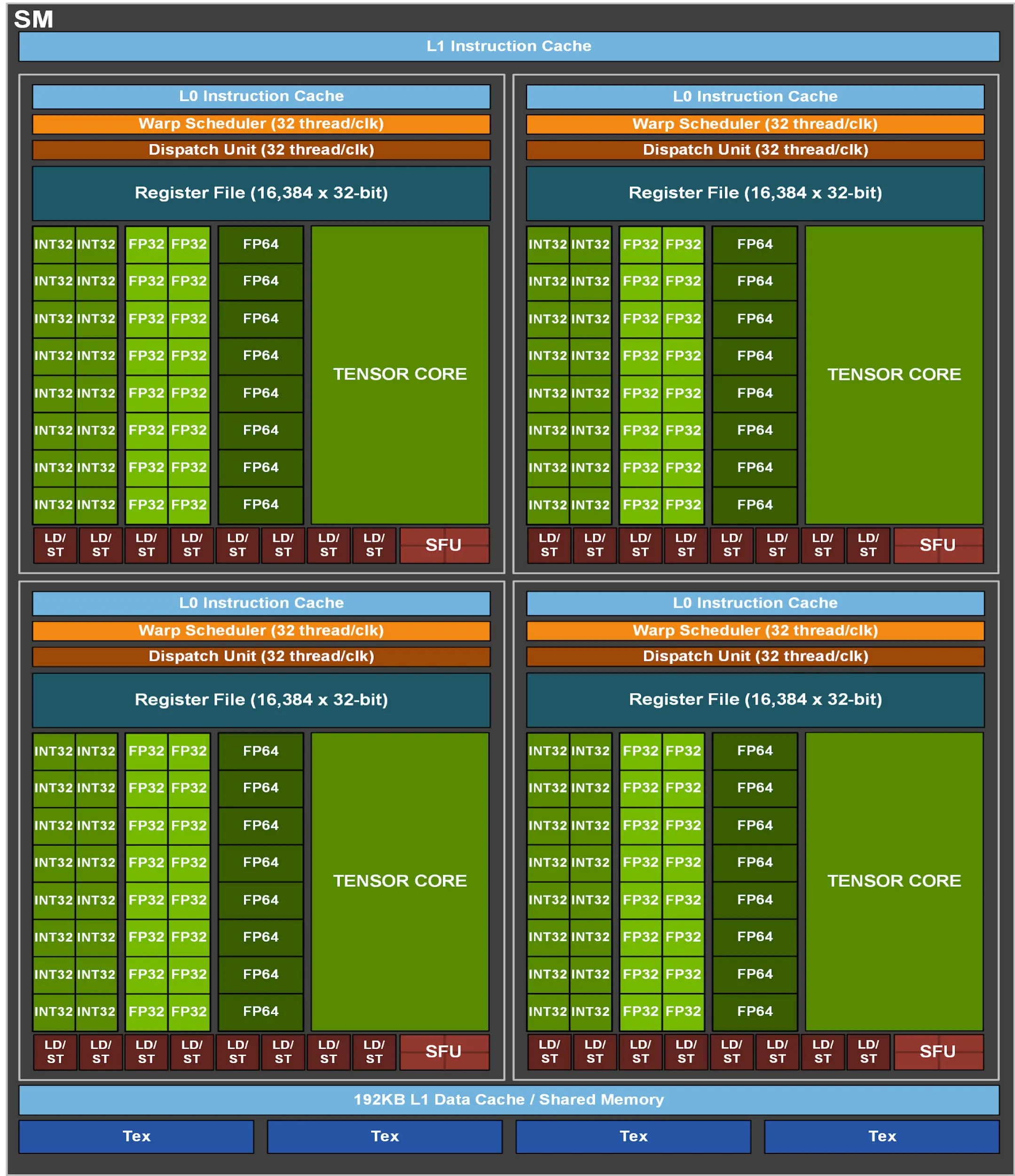- 4 Third-generation Tensor Cores/SM, 512 Third-generation Tensor Cores per full GPU