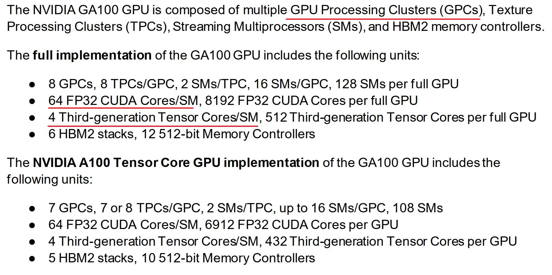 后面还提到了另外一个版本(The NVIDIA A100 Tensor Core GPU implementation of the GA100 GPU)的配置,看起来像是缩水版。