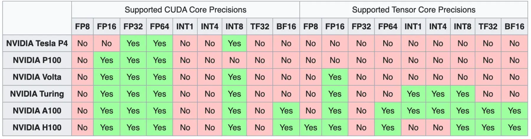更详细的计算支持可以参见 CUDA#Data_types 和 CUDA#Tensor_cores 。H100 属于 Hopper 架构。RTX 3090 和 A100 属于 Ampere 架构。RTX 4090 属于 Ada 架构,表上没有。RTX 4090 计算能力是 8.9,从维基百科见其相比 Hopper 的 Tensor Core 多了 INT1 和 INT4 支持。FP64 表上写的是 speed tbd