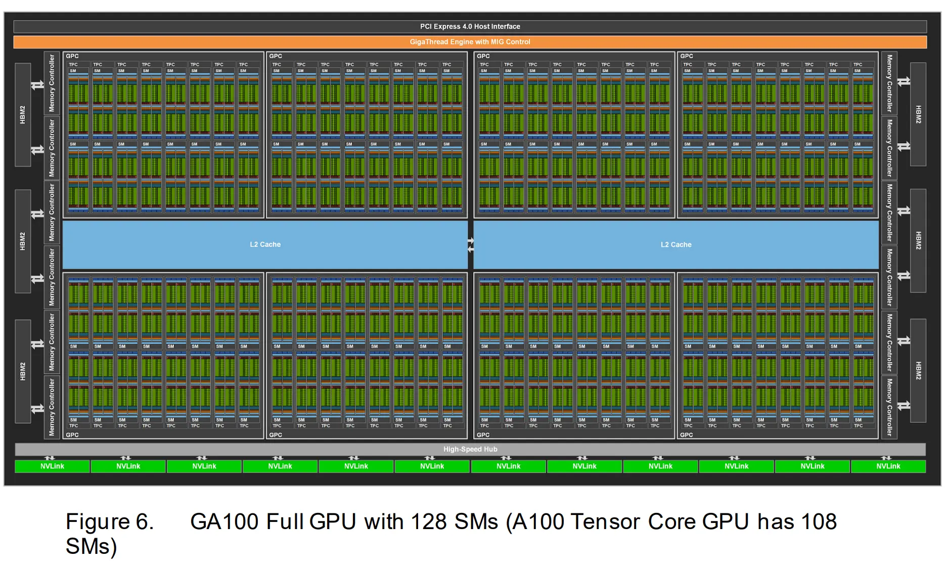 A100 白皮书第 20 页 画了 A100 更完整的图,可以看到 SM 一下子变得很小、很多。图片有点大放在这里也看不清楚,最好还是去链接里面看原图。