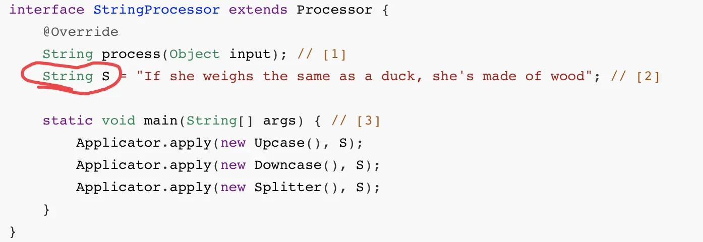 接口中的属性自动是 final 和 static 的。比如:S 自动就是 final 和 static 的,因为它是在接口中定义的。也正因为这样,接口曾用来方便地定义一组常量,不过 Java5 之后可以用 enum 替代 interface 实现部分功能了。