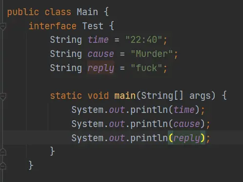 这个特性还能用来做测试。比如我根本不想给每个常量域提供冗长的 private static 前缀:(main 仍然要加 static,否则就不能被识别成类中可以运行的 main 方法,而是成为一个接口中的方法)