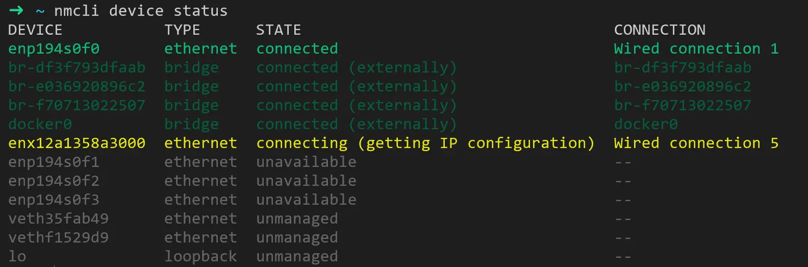 尝试了这个解决方案:在 /etc/netplan/01-network-manager-all.yaml 中禁止 nmcli device status