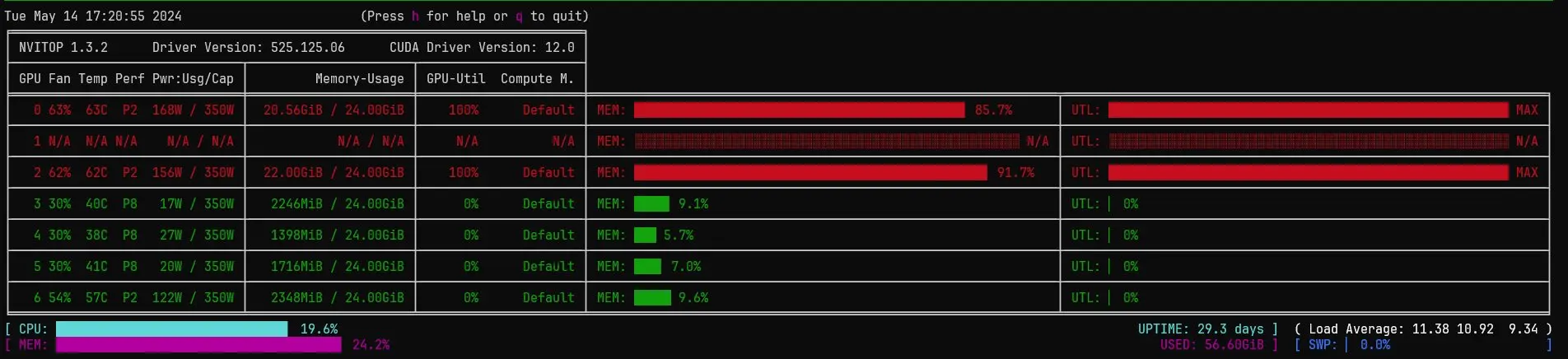 的速度较慢,在 7 卡的服务器上测试,nvidia-smi