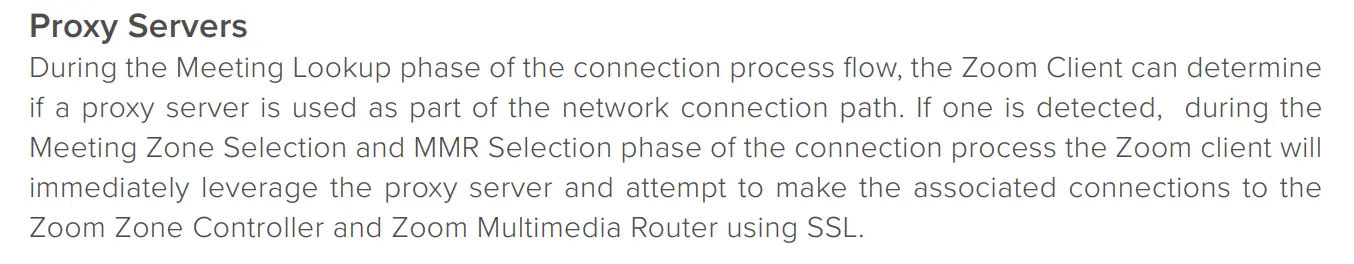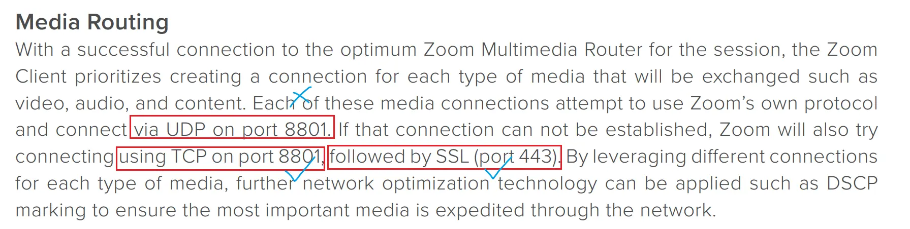 接下来 Zoom 的白皮书又提到了特殊情况(上图):如果 Zoom 发现了代理的使用,那么就不会使用 UDP 或者裸 TCP 传输,而是使用 SSL 传输。