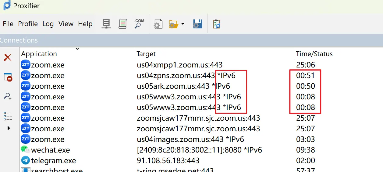 考虑到 Proxifier 的截图中出现了 IPv6,而且这是我刚刚进入会议的时候截的图,创建的 IPv6 连接应该是在和多媒体路由器通信用的。我觉得也可能是因为 SOCKS4 无法代理 IPv6 导致我这边卡。