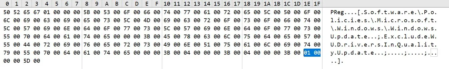 文件,发现数据的确被写入了。比如启用“Windows 更新不包括驱动程序”,对应的文件如下: