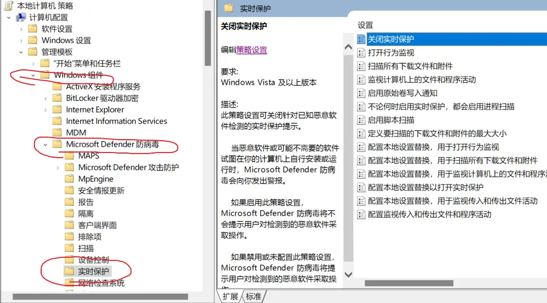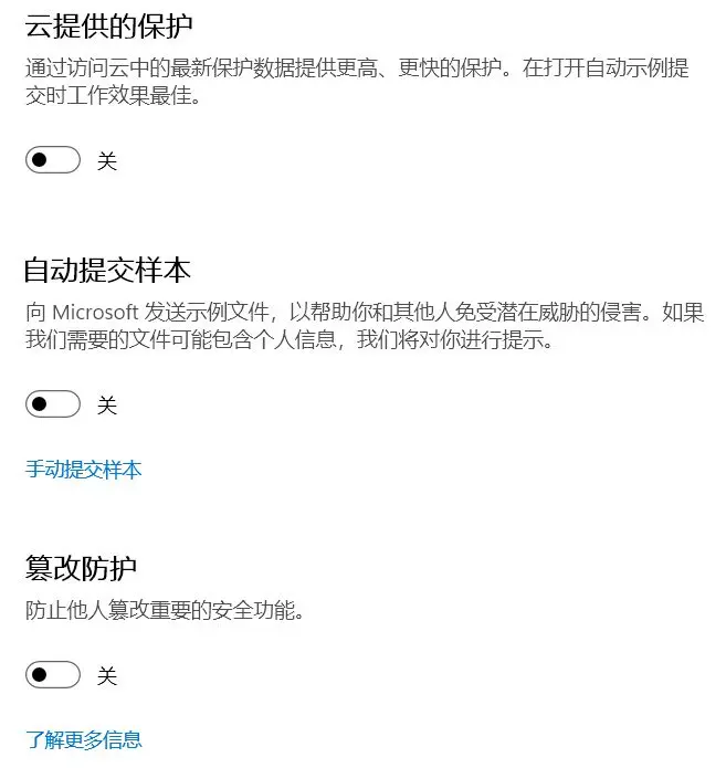 实时保护关闭之后还要在 Windows Defender 页面关掉其他几个相关项目,否则实时保护会自动打开。如果不在组策略中关闭实时保护,则重启后实时保护会自动打开,所以这两件事都要做。
