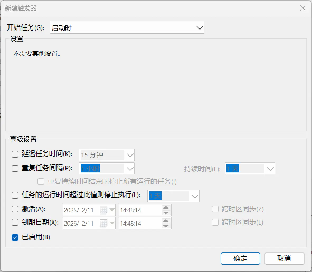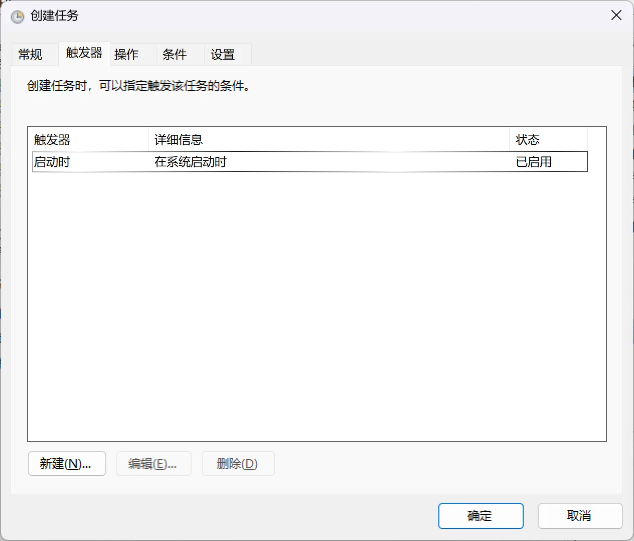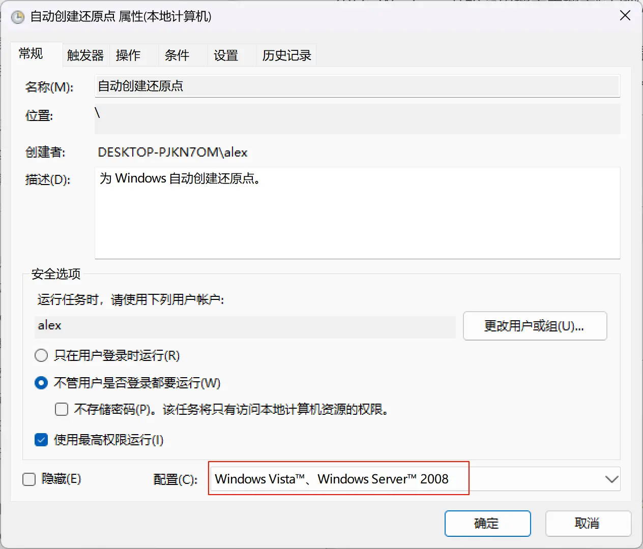 点击右侧的“创建计划任务”,选择“不管用户是否登录都要运行”,启用最高权限,配置别动(不要选 Windows 10!会导致配置失效)。别急着点确定,翻到第二页“触发器”,选择“启动时”,点击确定。