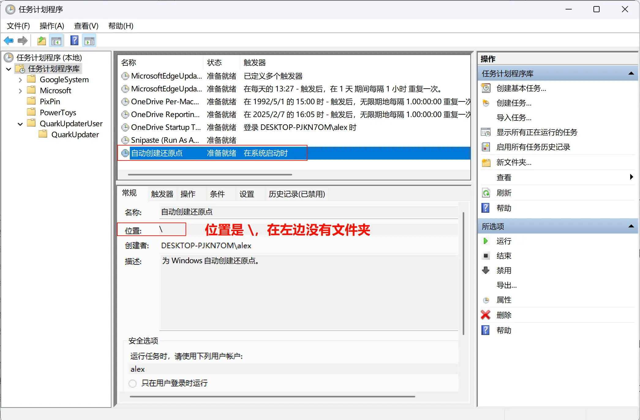 接下来在“条件”选项卡里面关闭唤醒时启动(这样是不是每次开机才跑一次而不是每次唤醒就跑一次?)和不充电时不启动,然后点击确定,输入账户密码(可能时因为设置了更高权限运行)即可创建。因为我创建的位置是在根,所以能在下图找到我计划的任务。