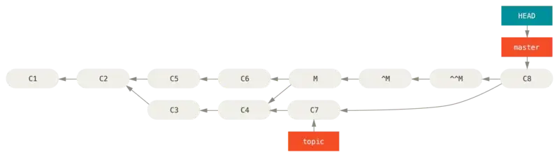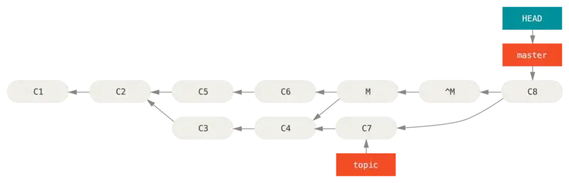 但是,如果之后还想要合并 topic 分支就会出现问题。因为我们之前用了 revert,topic 这一段 commits 被认为是我们不需要的。如图,创建合并 C8,只有 C7 这一个 commit 会被带入 C8,而 C3 和 C4 会被忽略。