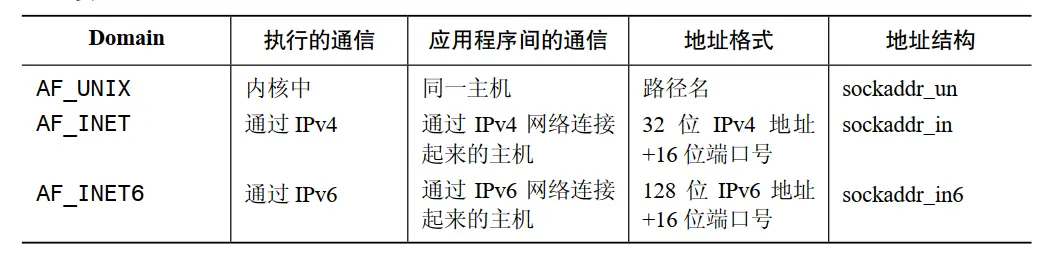 SUS 规定 socket 至少可选以下的 domain,具体实现可以提供更多选择:(AF 表示地址族,PF 表示协议族,早期设计人员认为一个协议族可以支持多个地址族,但实际上协议族和地址族基本上是一一对应的关系,而且所有 PF_ 开头的常量都被定义成对应的 AF_ 开头的常量。)
