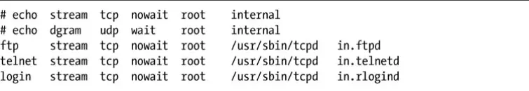 几列数据分别是服务的名称(可以根据 /etc/services 查到服务对应的端口,理论上有些服务在不同协议下有可能使用不同端口,但是我看 /etc/services 中的服务都是 udp 和 tcp 用相同的端口号)、socket 的类型、协议、标记(要么是 wait,要么是 nowait;wait 表示在子进程运行时暂时将对应 socket 从监听列表中移除,等子进程退出后再次加入监听)、登录名(控制子进程的用户名和组名,由于 inetd 是 root 运行的,所以不控制子进程的凭据会有很大的风险)、程序位置、参数列表(图中只提供了 aegv[0])。