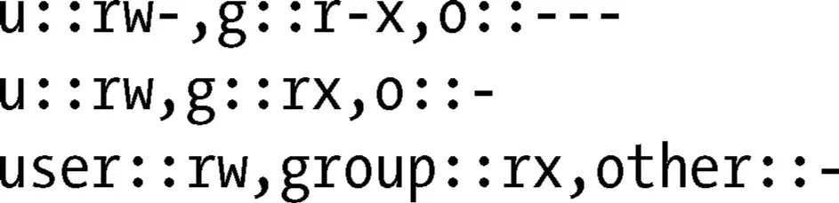 (标记类型、标记限定符、权限集合)。当 tag 为用户或者组时,不提供限定符则表示文件所属用户或者所属组,提供限定符(用户名或者组名)则表示给定的用户或者组。一些例子: