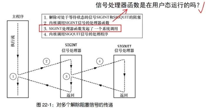 要注意信号处理器函数是在用户态调用的,所以一个信号处理器在运行过程中还是可能发生内核态和用户态的切换。