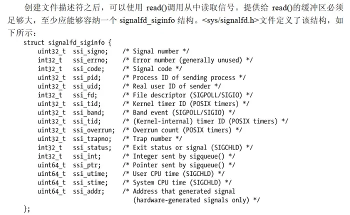 系统调用。利用该机制可以创建一个文件描述符,信号可以从其中读取,这样也实现了同步接受信号(没有信号处理器函数在交替执行就是同步的)。为了此系统调用正常工作,需要将要读取的信号先用 sigprocmask