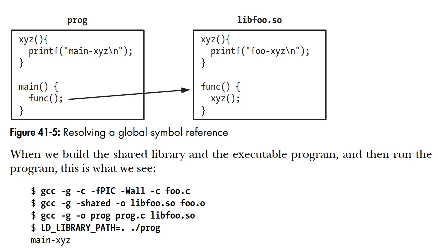 选项,要求在编译共享库的时候就尽可能提前绑定内部定义的全局符号,这样生成的程序就不会意外地调用 prog 中的 xyz()
