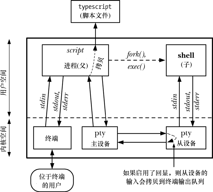- script(1) 这个时候像是驱动程序,接收用户输入,在用户和子进程(shell)之间传递信息。